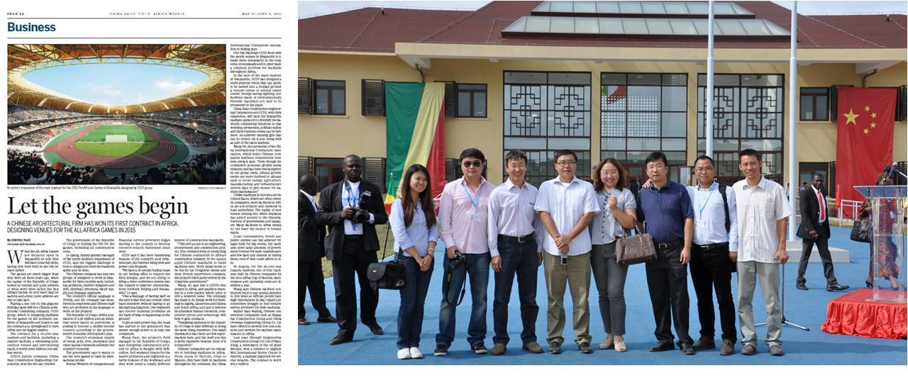 2013-06-04近期,由中国建筑总公司承接工程总包施工建设、CCDI负责项目设计工作的位于非洲刚果共和国的布拉柴维尔国家体育场项目接受了《CHINA DAILY中国日报》的专访,我司该项目团队负责人吕强、汪嘉懿以及项目团队成员参与了此次专访,该采访文章刊登于《CHINA DAILY中国日报》2013年5月31日—6月6日非洲专版。