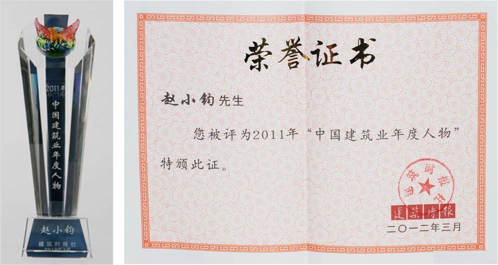 2012-08-17日前,由《建筑时报》主办的“2011年中国建筑业年度人物”评选揭晓。我司总经理赵晓钧荣膺年度人物称号。评委会对赵晓钧在致力于企业管理变革、积极探索适应市场需求的新的组织格局、在寻求商业成功的同时,注重对于价值观及企业文化的深植、努力搭建以人为本的发展平台所付诸的创新实践给予了高度评价,并最终授予其年度人物称号。