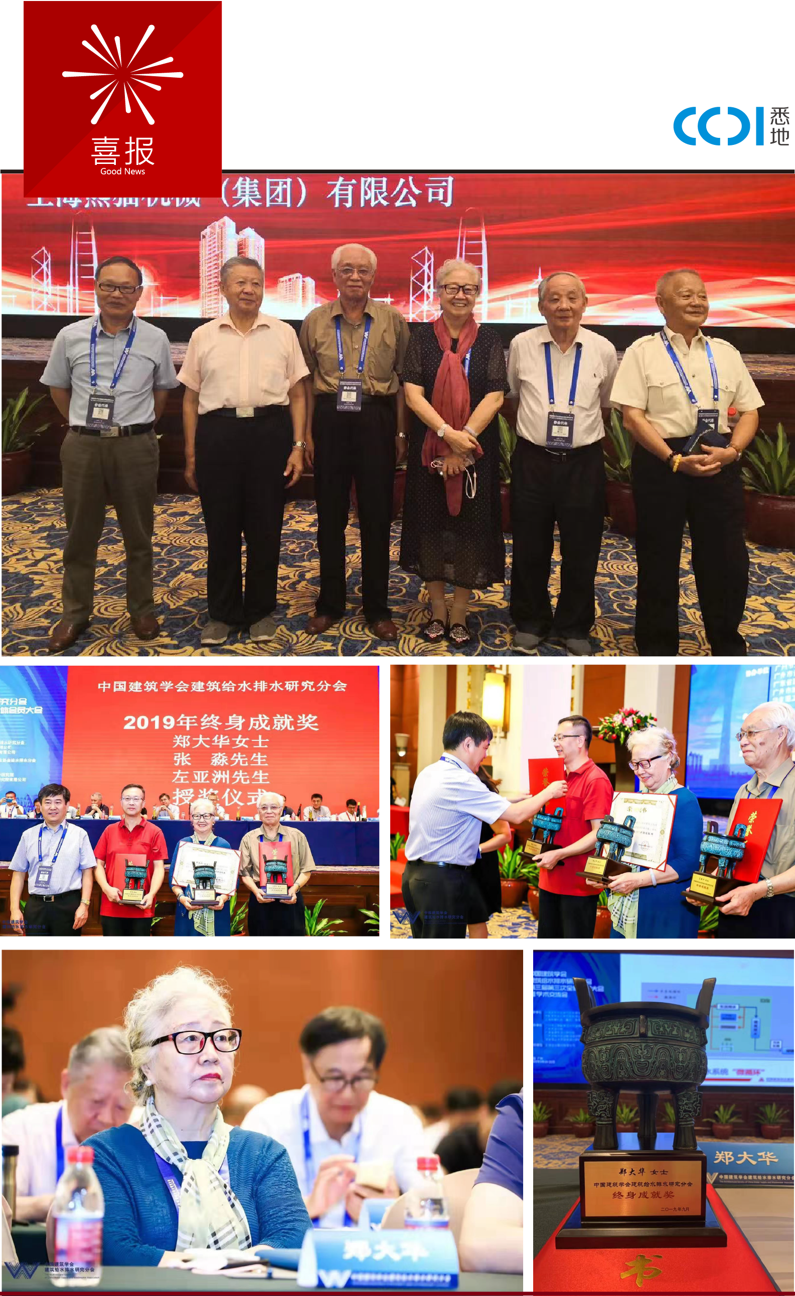 2019年9月21日,在中国建筑学会建筑给水排水研究分会第三届第三次全体会员大会暨学术交流会上,CCDI给水排水顾问总工郑大华荣获中国建筑学会建筑给水排水研究分会终身成就奖。