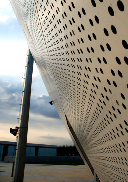 • 中心赛场的白色罩棚恰似12片纯洁的花瓣盛开在绿森林里并向天空伸展