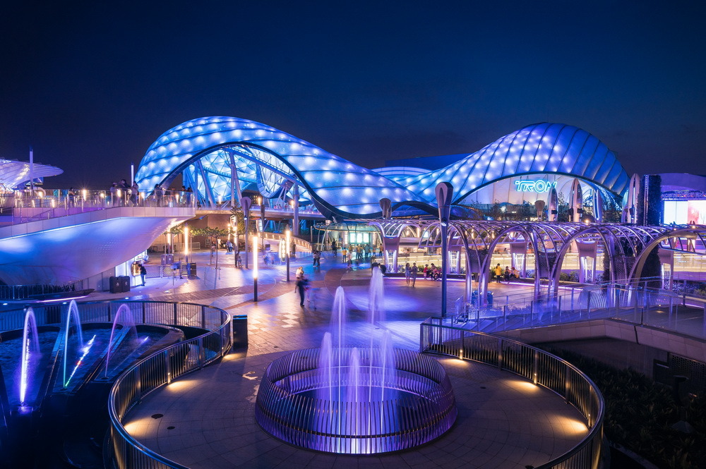 • 蓝色的ETFE泡泡白天折射出五彩的天空,夜晚变换的灯光,加上呼啸而出的过山车从下方驶过,非常激动人心